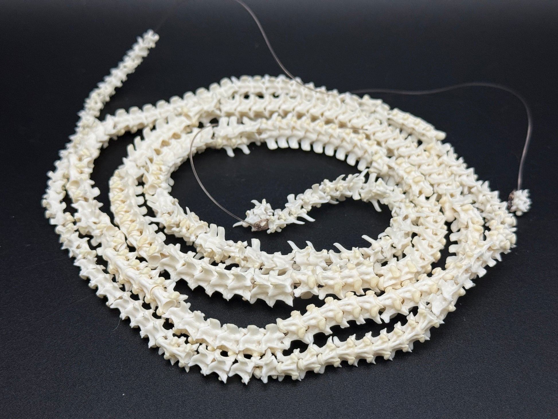 Beetle cleaned boa constrictor vertebrae. Each string has most the vertebrae from a single boa constrictor and measures between 48 to 51 inches and should have around 170-200 vertebrae.
