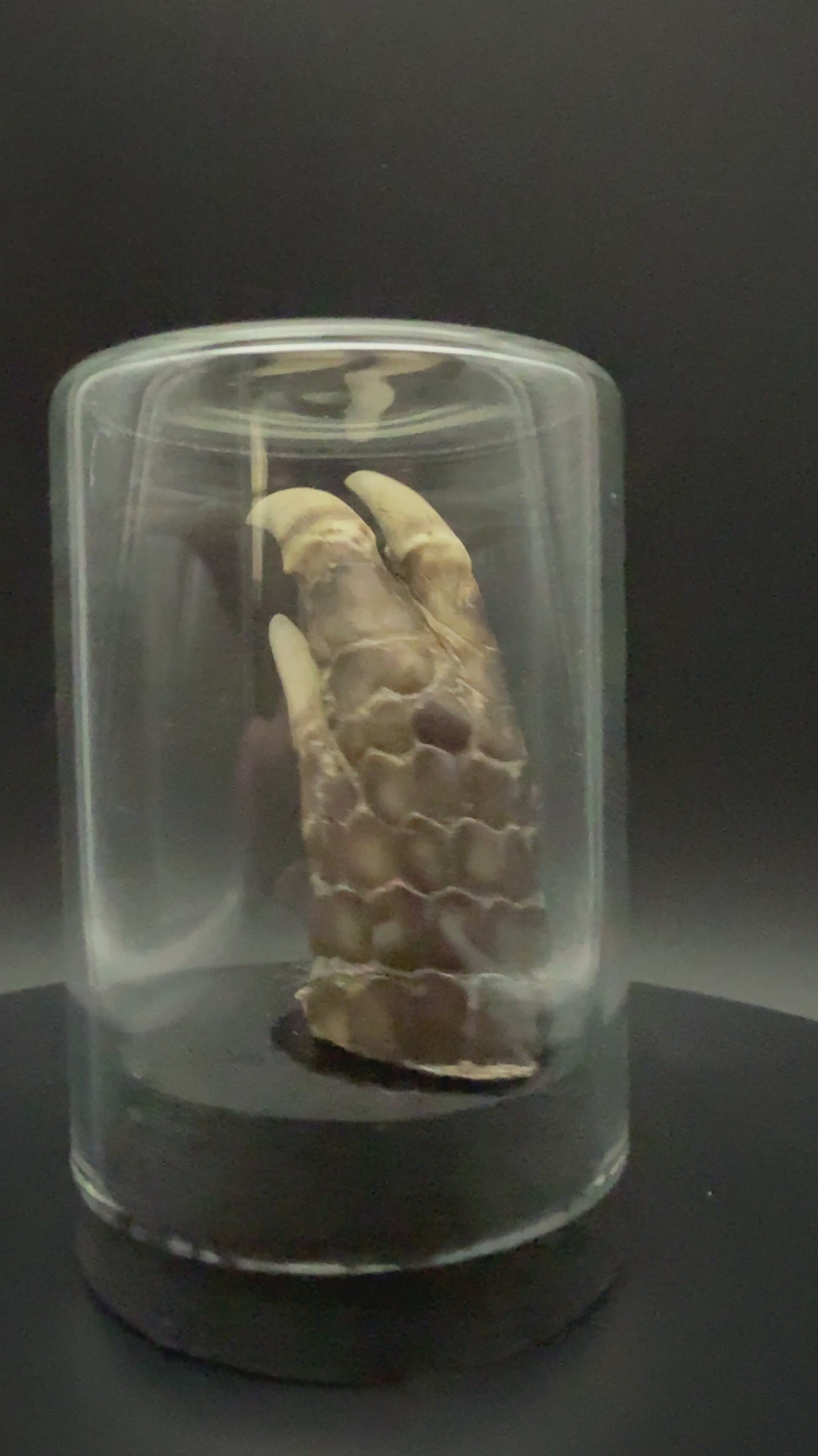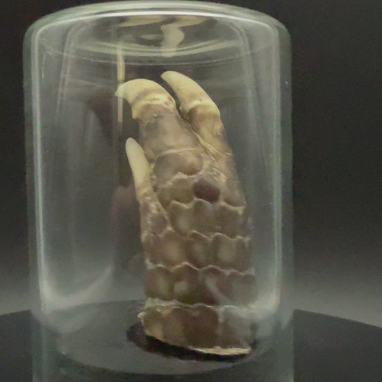 Mummified armadillo foot in a 2 1/2 inch by 1 3/4 inch glass display